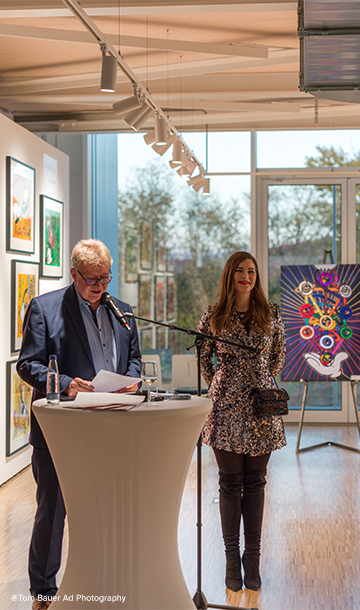 Die Vernissage begann um 18:10 Uhr mit einer herzlichen Begrüßung durch Museumsleiter Bernhard Feil, gefolgt von einem inspirierenden Vortrag des Kunsthistorikers Dr. Wolfram Frietsch, der die Symbolkraft und kulturelle Bedeutung der Arbeiten in den größeren Kontext von Kunst und Philosophie stellte. Anschließend gewährte Karina Mack persönliche Einblicke in die Entstehung und emotionale Tiefe ihrer Werke.