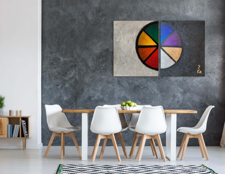 A dance of light and shadow, of day and night – united in the color spectrum of life. The work reveals the quiet pulse of karma, connecting becoming and passing away. Embedded crystals make energy visible – a symbol of the inner radiance that unites spirit and matter.