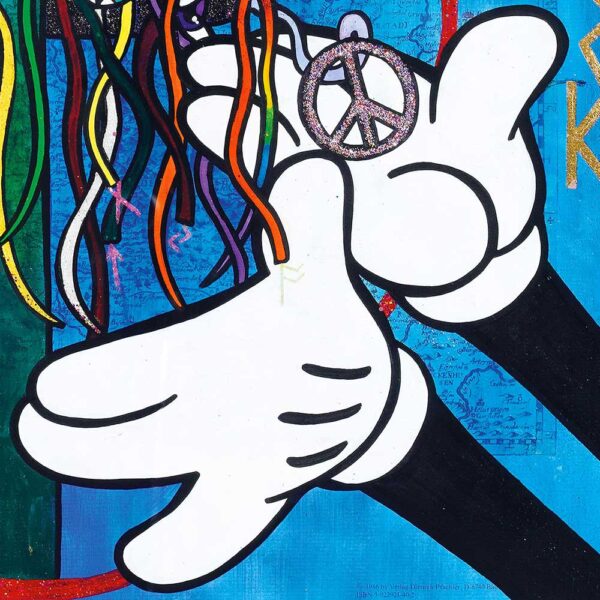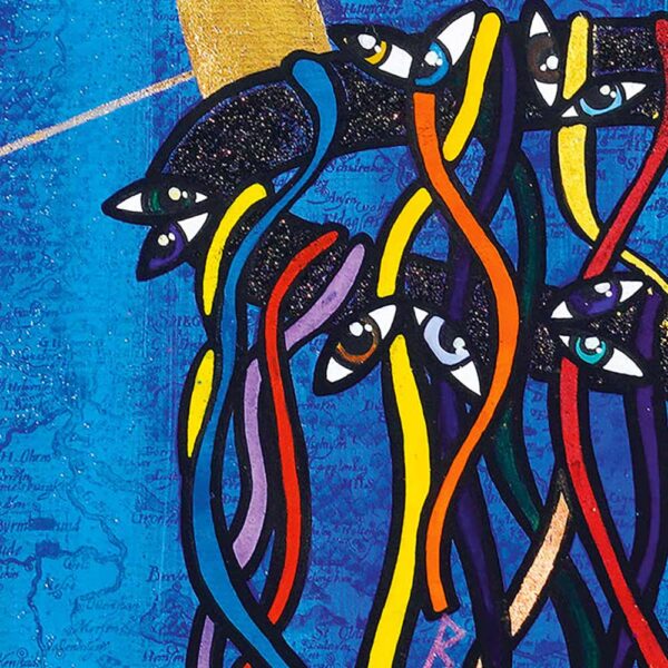 Im Zentrum schwebt ein stilisiertes Friedenssymbol, das an den Weltenbaum oder die kosmische Achse erinnert – ein Sinnbild für Verbindung zwischen Himmel und Erde sowie für innere Reifung. Die herabhängenden, vieläugigen Bänder stehen für erweiterte Wahrnehmung, Einsicht und den Perspektivwechsel, den der Gehängte einleitet.