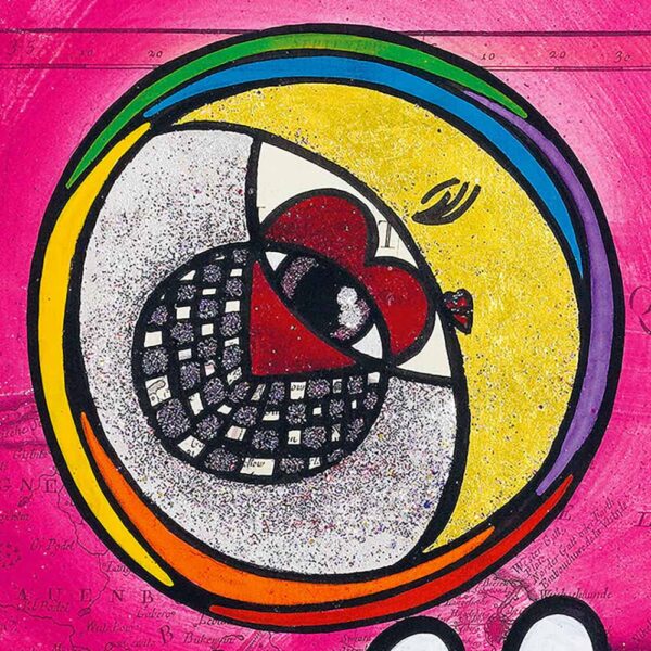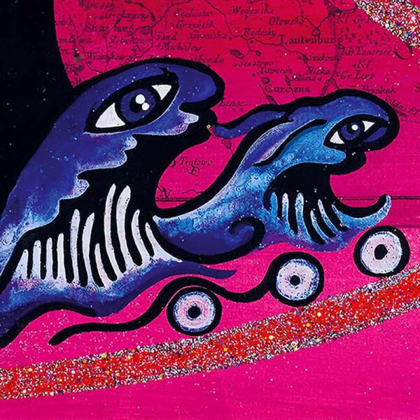 Im Hintergrund verweist eine historische Karte Westpreußens (1776) auf die verborgenen Landschaften des Unterbewusstseins. Im Zentrum erhebt sich eine expressive Hand, umgeben von dynamischen Linien und Symbolen. Der Mond mit Herz und Auge steht für innere Wahrnehmung, Täuschung und tiefere Erkenntnis.