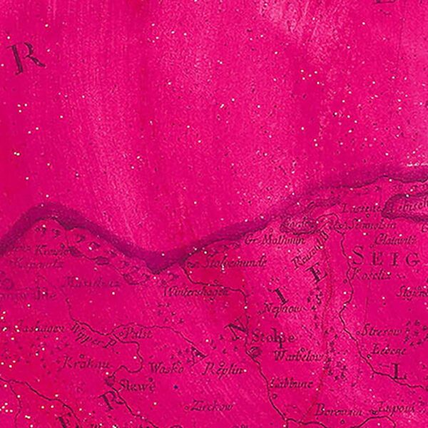 69,5 x 54,5 cm, gezeichnet auf antiker Landkarte, Büttenpapier, Mixed Media, Natur-Pigmente, Acryl & Aquarell, Sterlingsilber, veredelt mit 24 Karat Gold, 2025