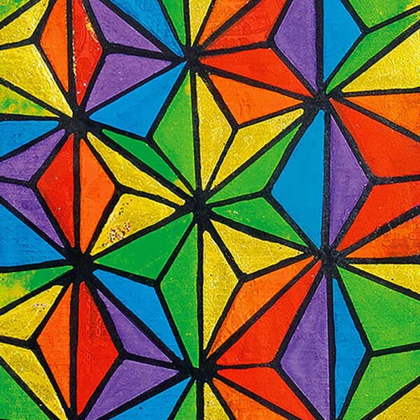 Auf tiefviolettem Grund entfaltet sich ein geometrischer Turm aus Sternmustern – Sinnbild für inneres Wachstum und die Verbindung zwischen Erde und Himmel. Funkelnde Linien verweisen auf schöpferischen Fluss und Inspiration.