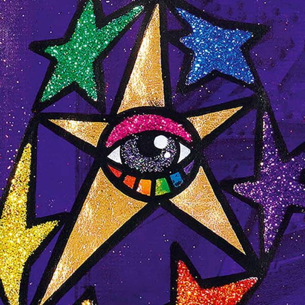 Im Zentrum strahlen zahlreiche Sterne in klaren geometrischen Formen – Symbole für Orientierung, Vision und das höhere Selbst. Die zentrale Formation erinnert an den achtzackigen Stern des Tarot, Zeichen für Klarheit und spirituelle Führung.