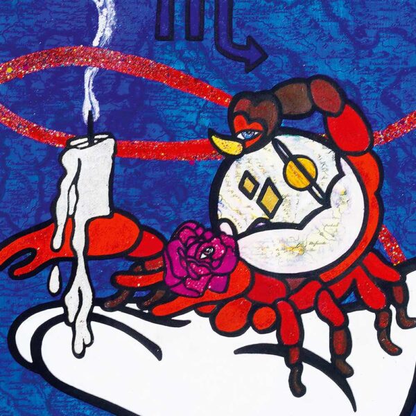 Im Hintergrund verweist eine historische Landkarte des Herzogtums Lothringen (um 1690) auf die zeitlose Dimension des Wandels. Im Mittelpunkt stehen zwei stilisierte Hände: die eine geöffnet – Sinnbild des Loslassens –, die andere trägt eine erlöschende Kerze, eine Rose und eine schimmernde Kristallkugel. Diese Komposition deutet auf den Moment des Übergangs: das Vergehen des Alten und das Entstehen von Neuem.