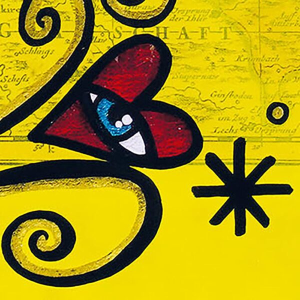 Das Werk zeigt zwei Hände, die sich in einem großen, roten Herzensband halten – Sinnbild für Vertrauen, Entscheidung und das Zusammenführen von Gegensätzen. Goldene Lichtstrahlen und geometrische Zeichen verweisen auf Klarheit, kosmische Ordnung und die schöpferische Kraft der Liebe.