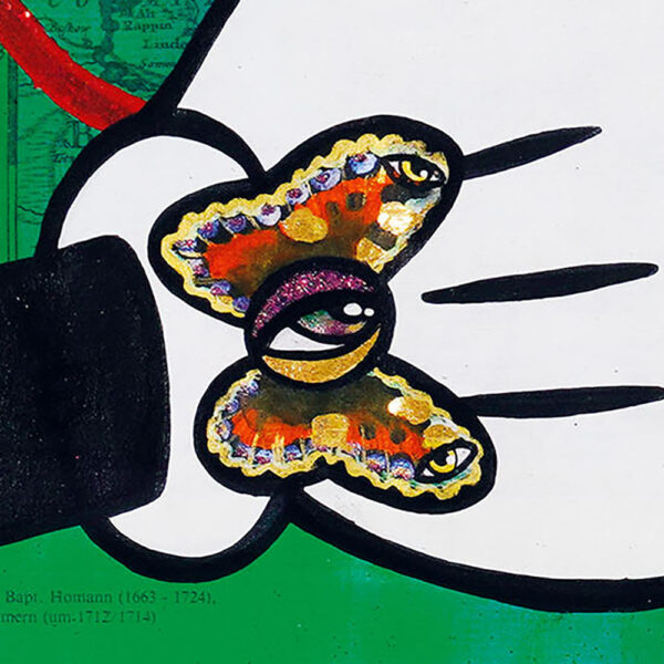 69,5 x 54,5 cm, gezeichnet auf antiker Landkarte, Büttenpapier, Mixed Media, Natur-Pigmente, Acryl & Aquarell, 2025