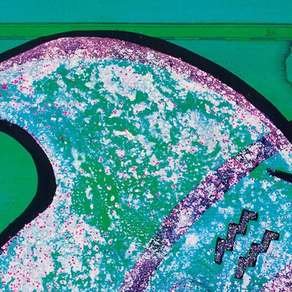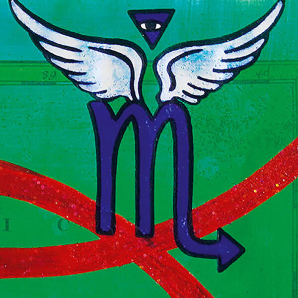 Im Zentrum steht ein farbintensives, kosmisches Rad, das an astrologische Symbolik anknüpft und die ewigen Kreisläufe von Aufstieg und Fall, Wandel und Beständigkeit zeigt. Eine Hand, die das Rad dreht, symbolisiert das Zusammenspiel von Schicksal und Eigenverantwortung.